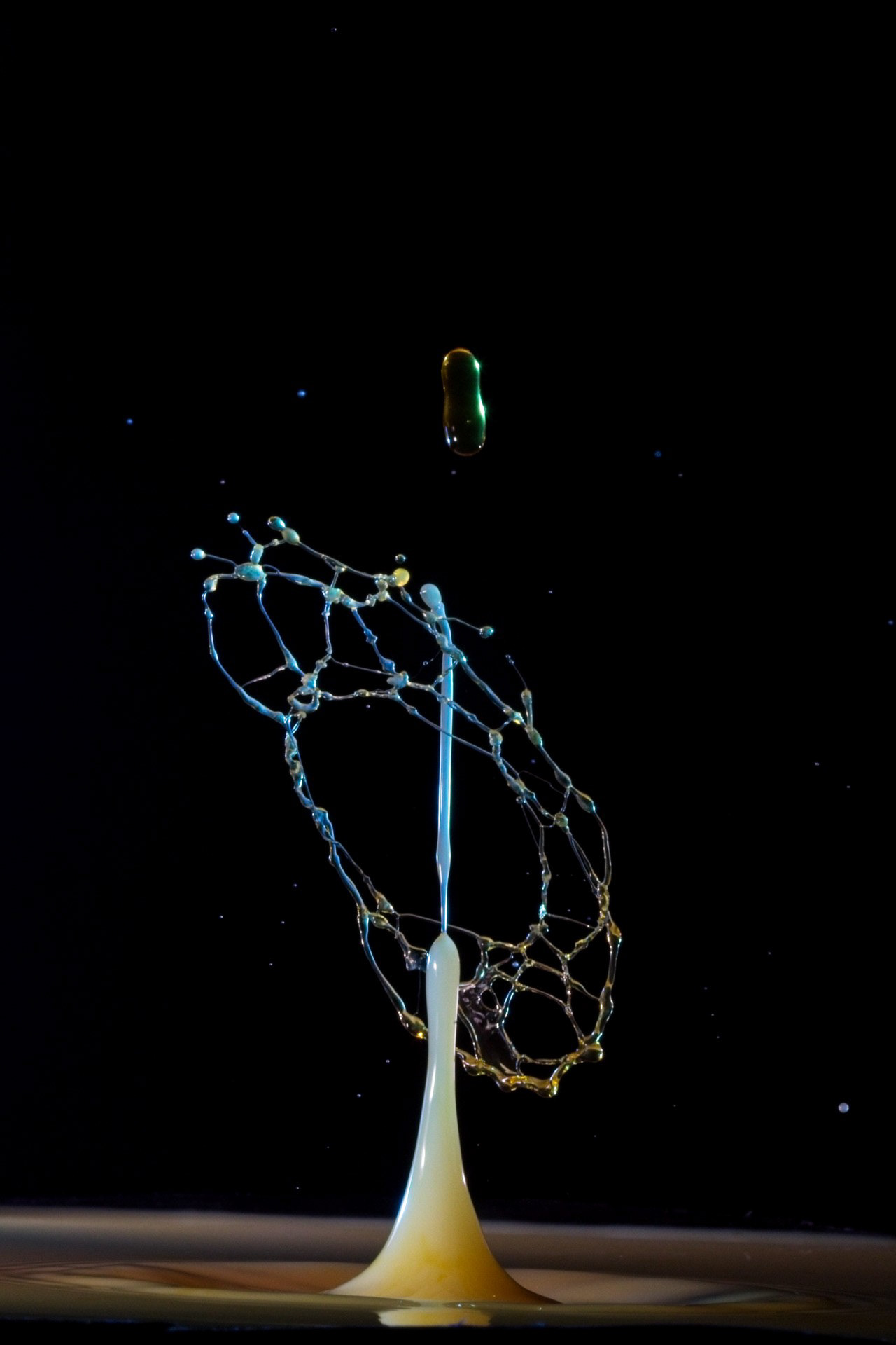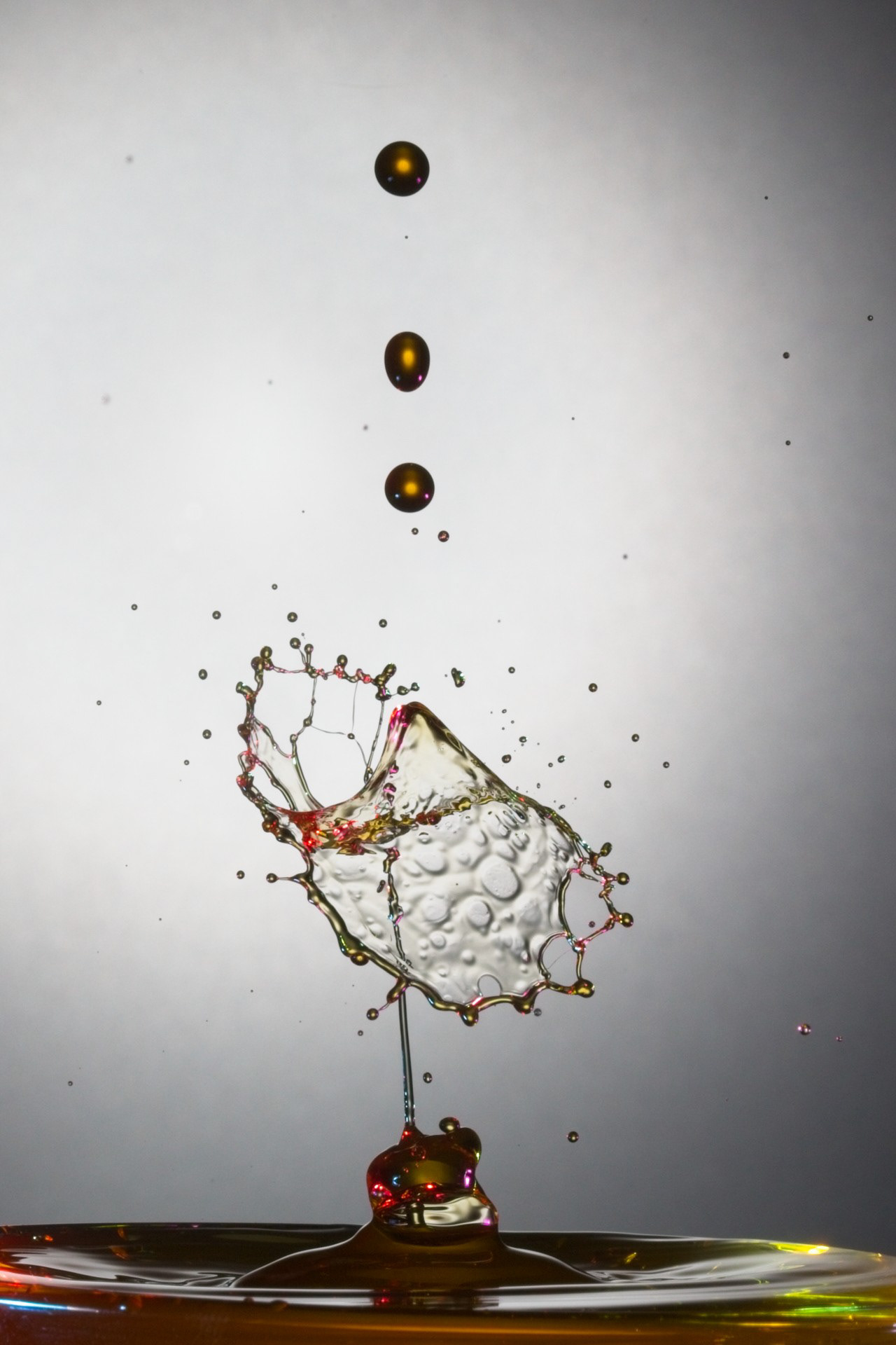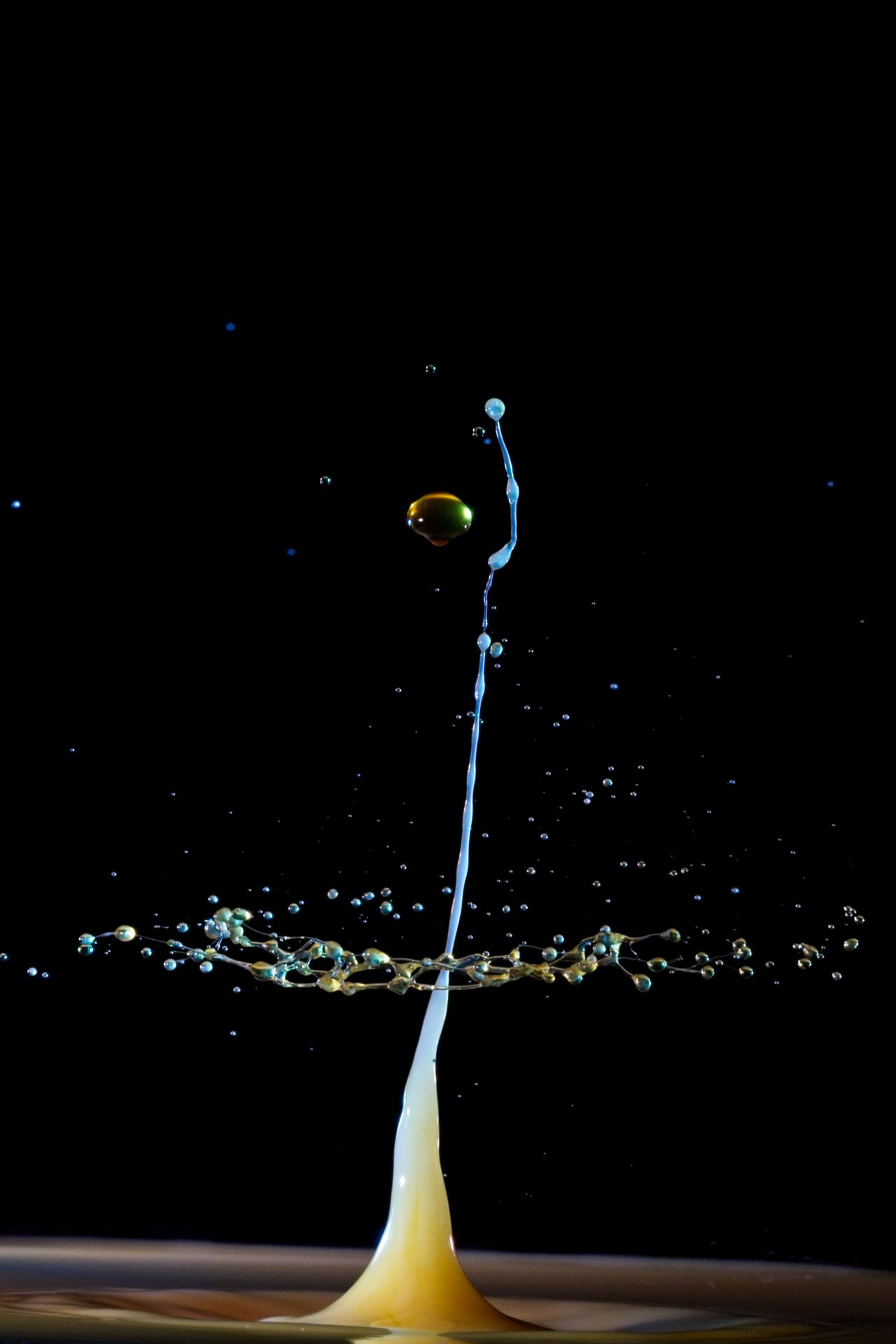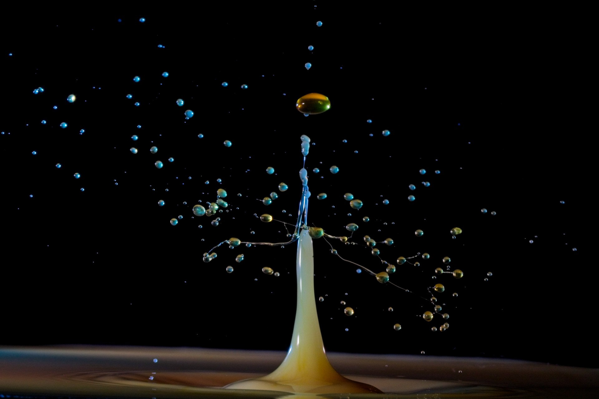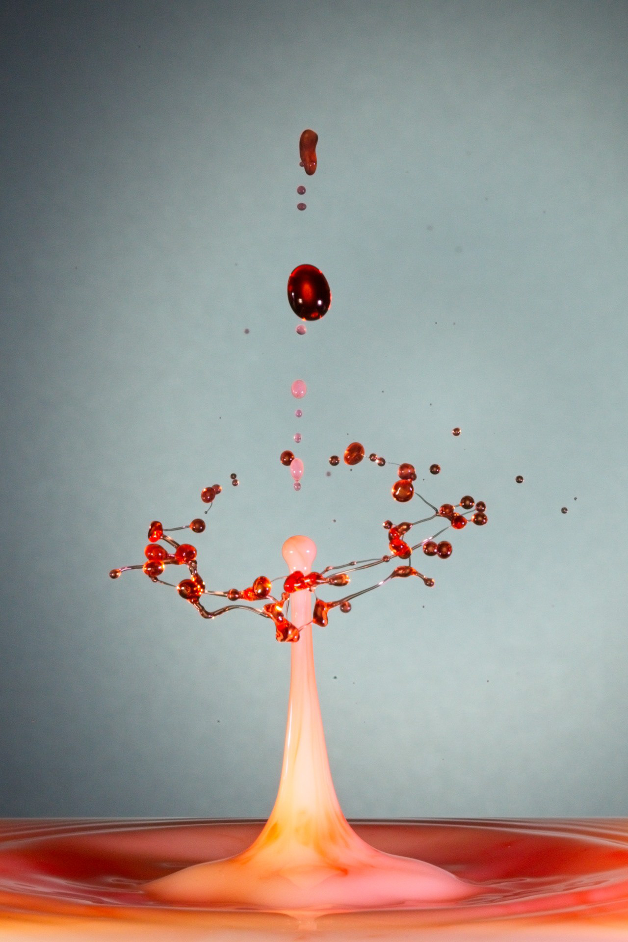 The key to success is not a fast camera shutter, but an extremely short flash duration (often 1/20,000 s or shorter), which actually freezes the motion. For this reason, drop collisions are usually photographed in a dark environment, with the flash triggered precisely by the falling drop—using timers, sensors, or microcontrollers. The photographer becomes a kind of conductor, synchronizing drop timing, flash delay, and background color.