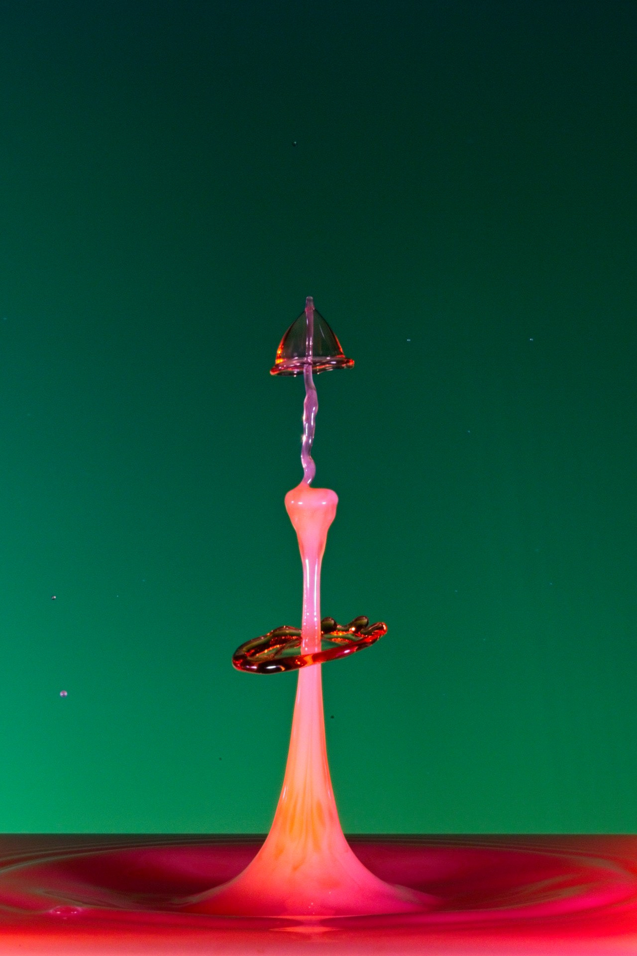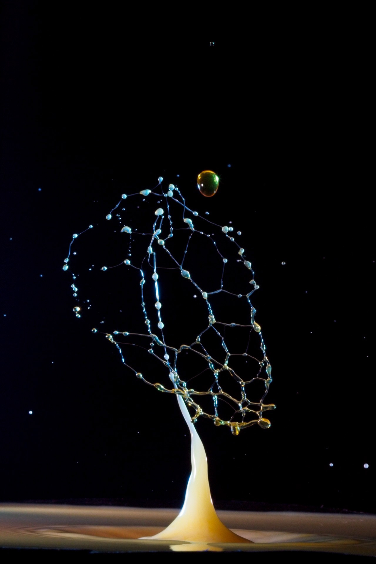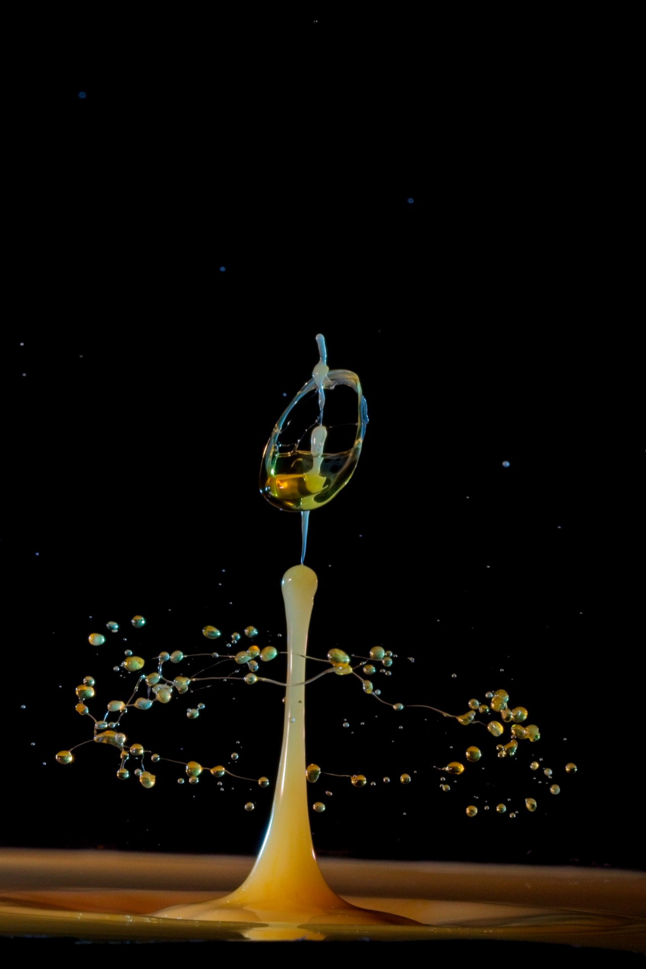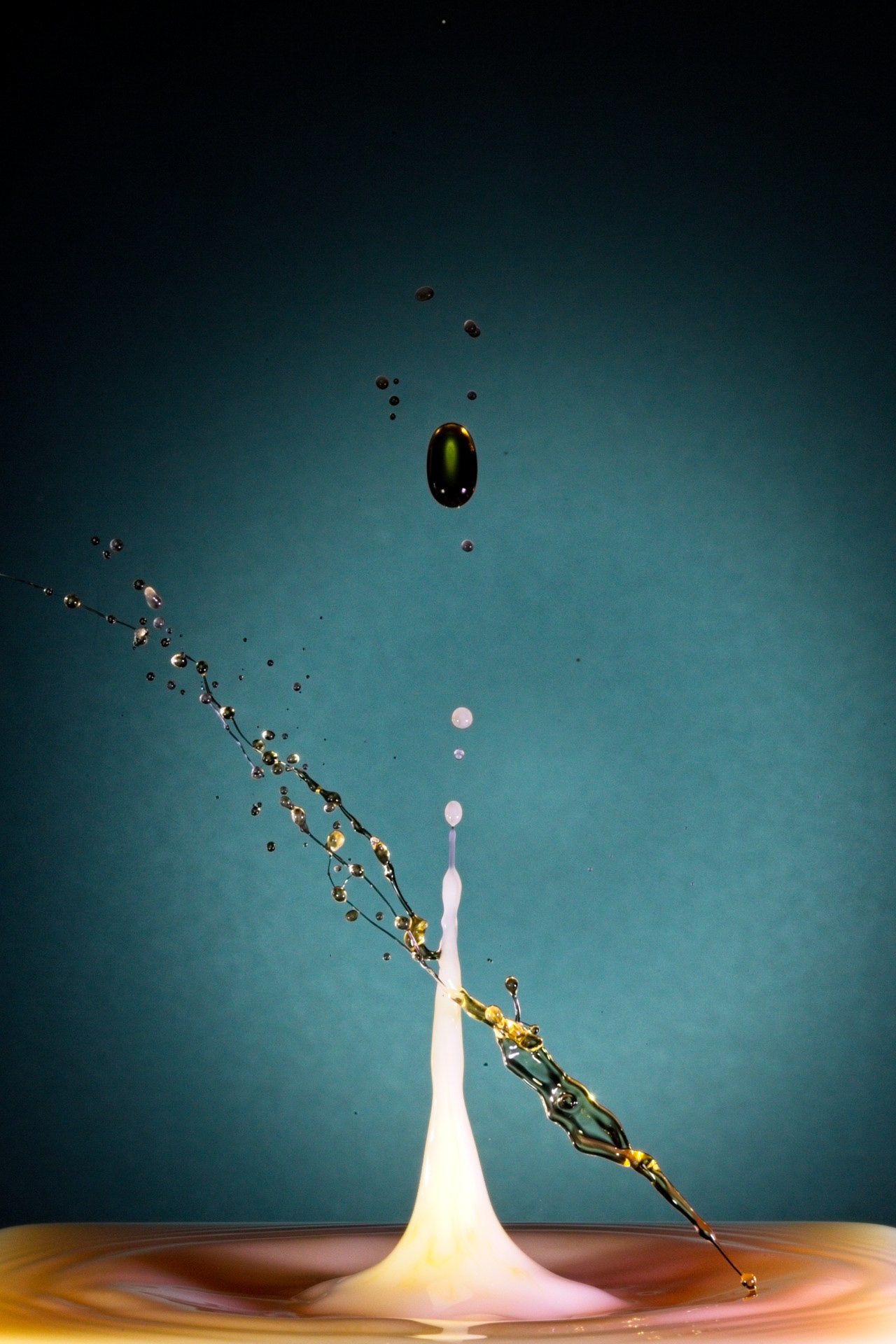 The key to success is not a fast camera shutter, but an extremely short flash duration (often 1/20,000 s or shorter), which actually freezes the motion. For this reason, drop collisions are usually photographed in a dark environment, with the flash triggered precisely by the falling drop—using timers, sensors, or microcontrollers. The photographer becomes a kind of conductor, synchronizing drop timing, flash delay, and background color.