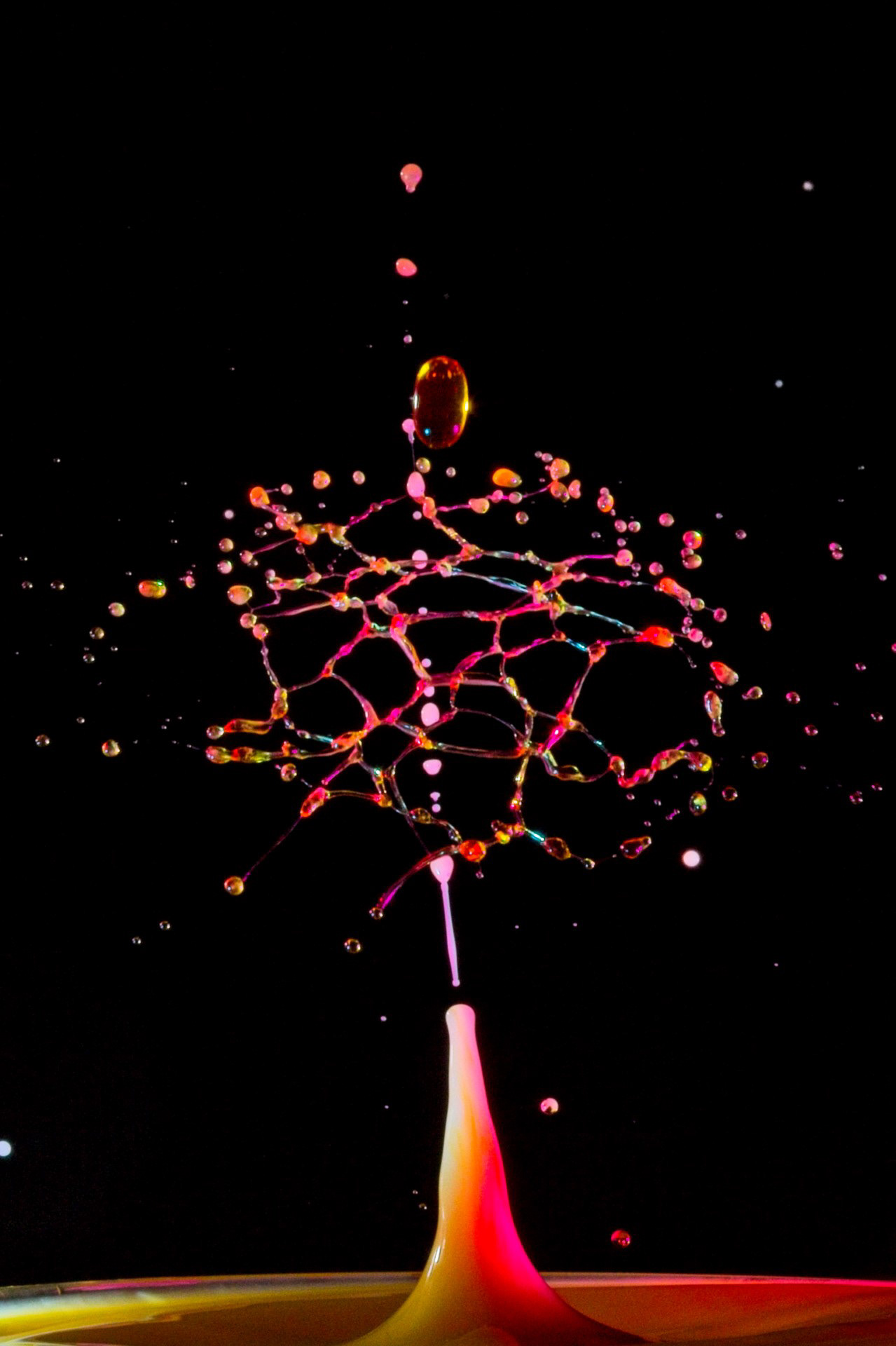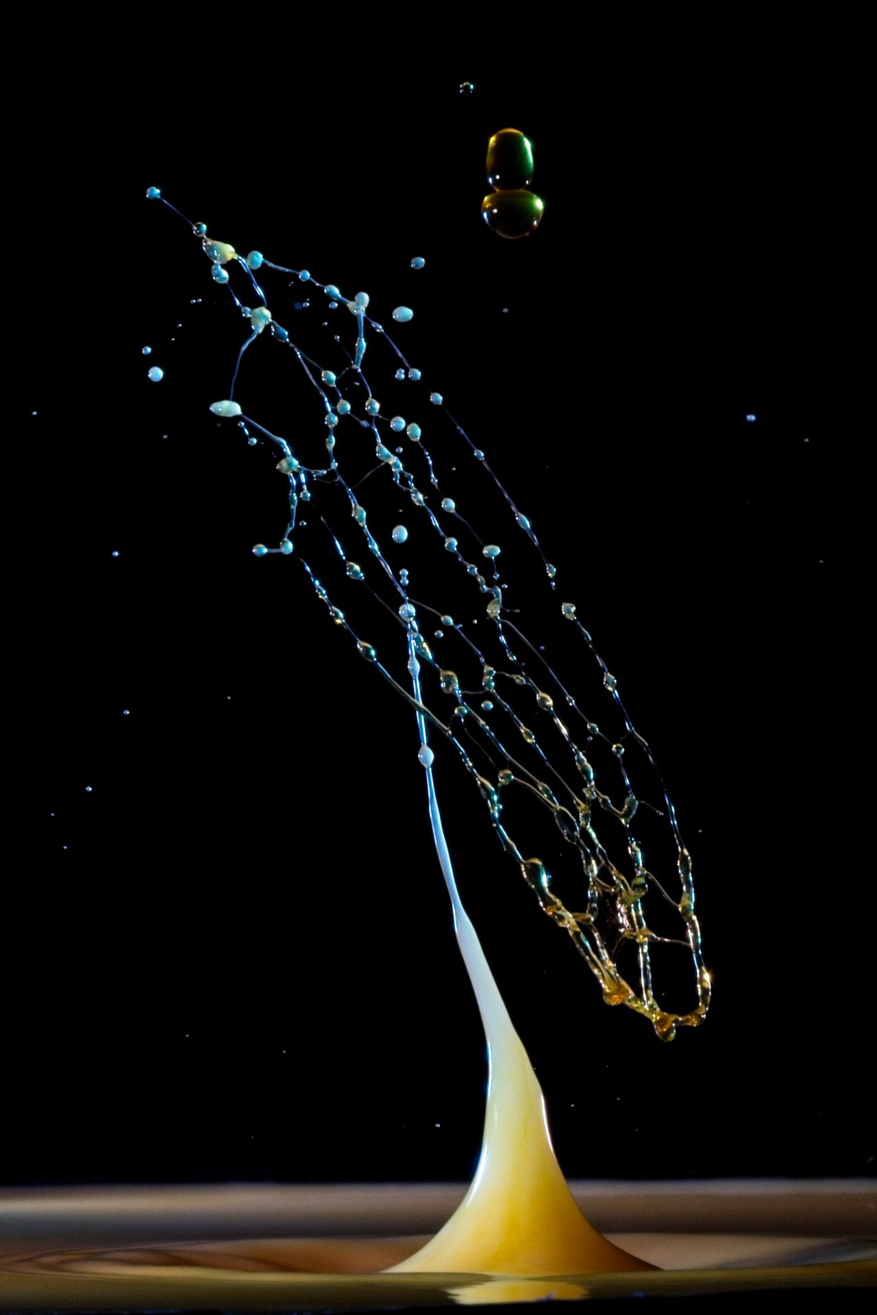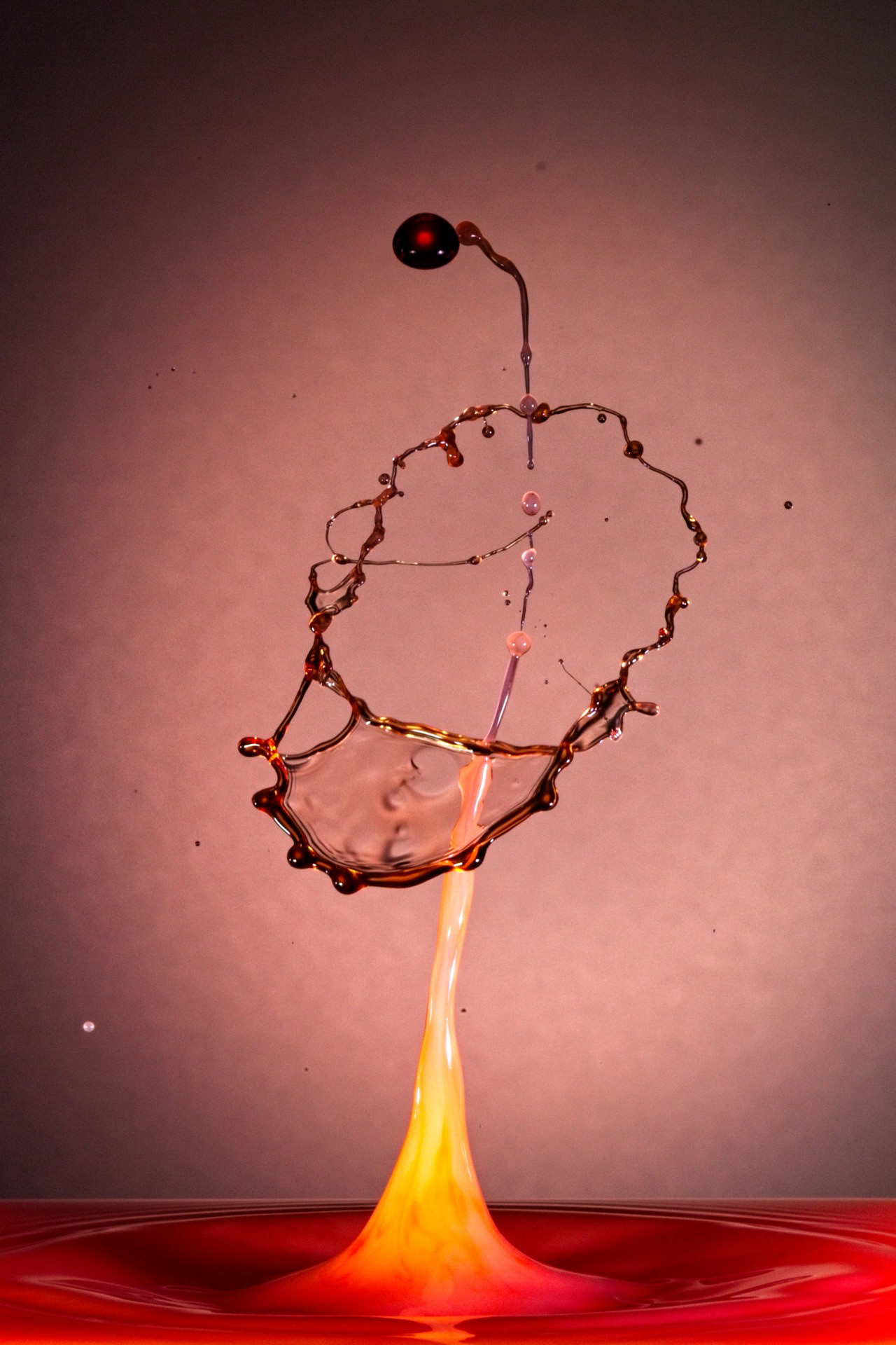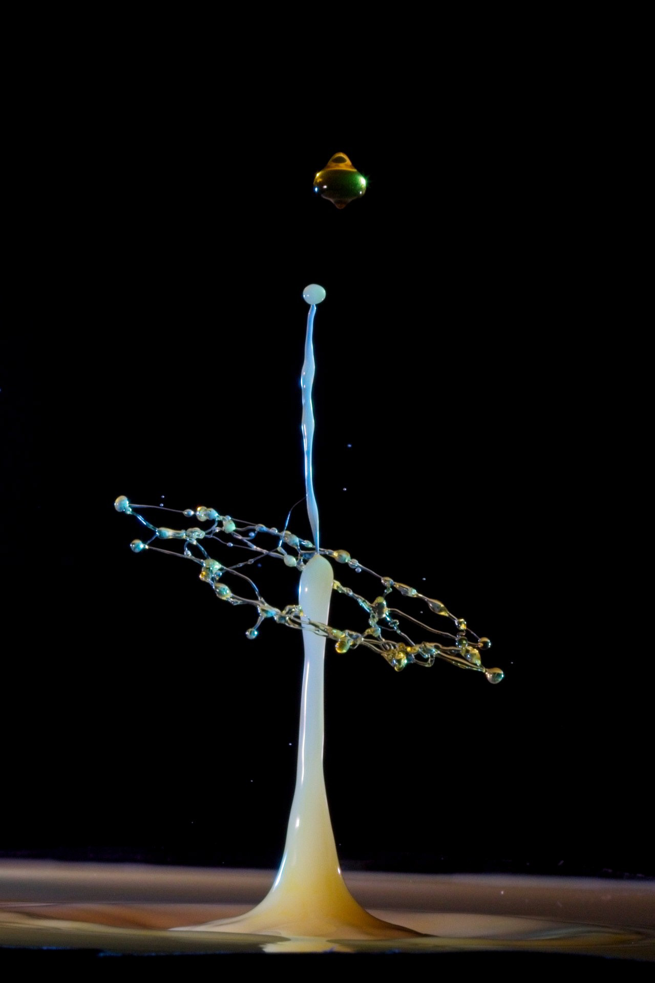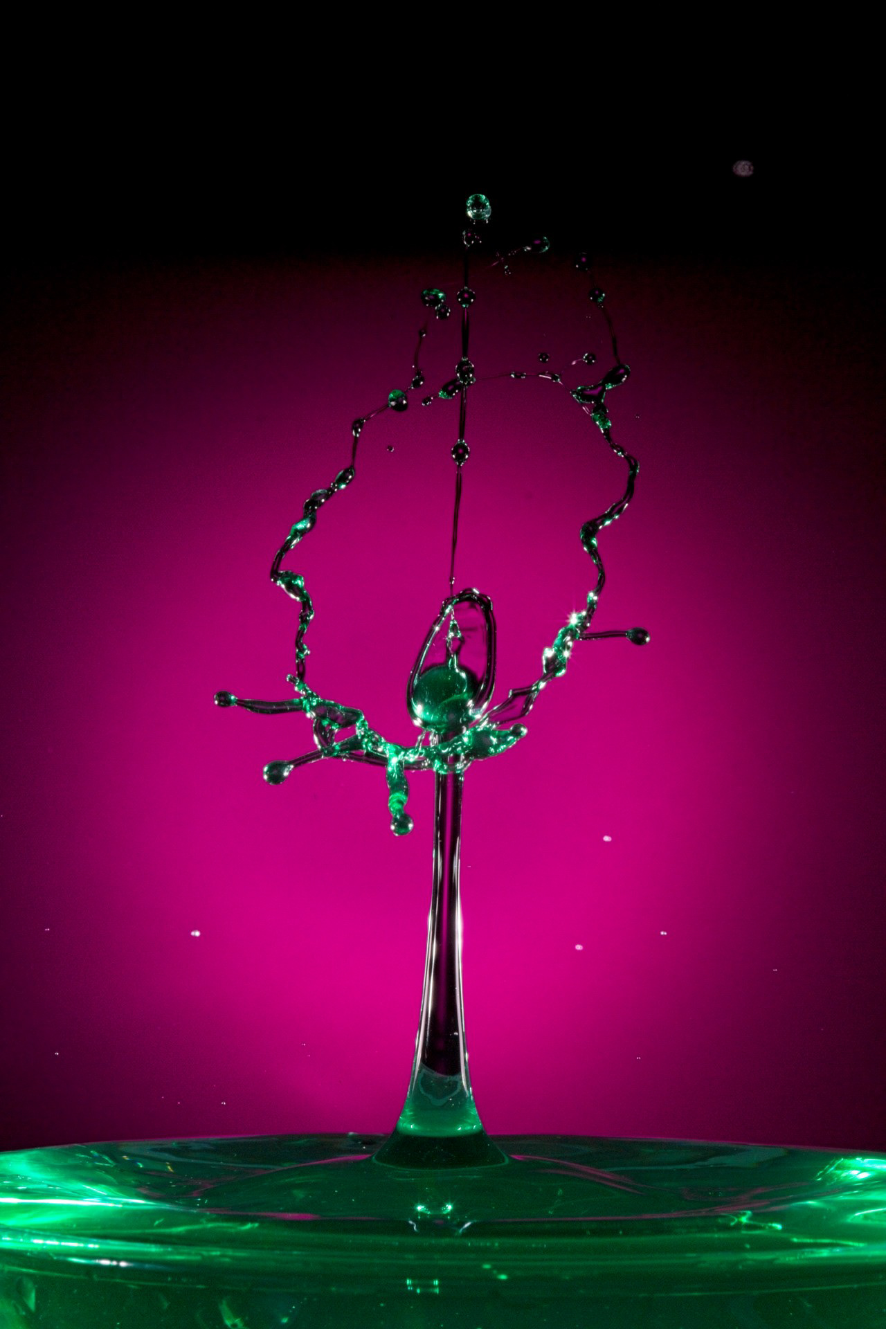 The key to success is not a fast camera shutter, but an extremely short flash duration (often 1/20,000 s or shorter), which actually freezes the motion. For this reason, drop collisions are usually photographed in a dark environment, with the flash triggered precisely by the falling drop—using timers, sensors, or microcontrollers. The photographer becomes a kind of conductor, synchronizing drop timing, flash delay, and background color.